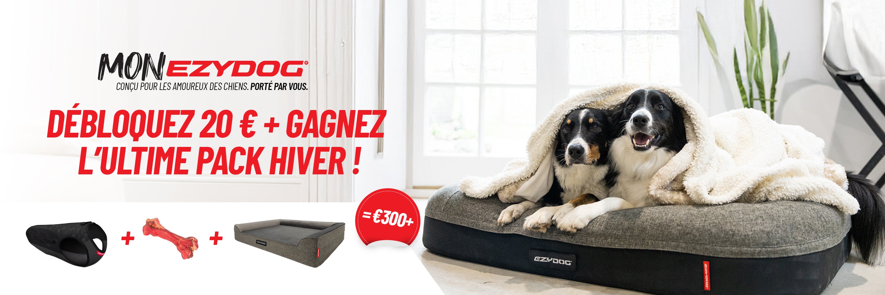 À partir de maintenant et jusqu'au 31 octobre 2025. Il vous suffit de compléter à 100 % le profil d'un animal pour participer automatiquement au tirage au sort et gagner l'Ultimate Winter Pack, composé au choix d'un lit orthopédique pour chien, d'une veste THERMAX et d'un jouet à mâcher Ezybone !