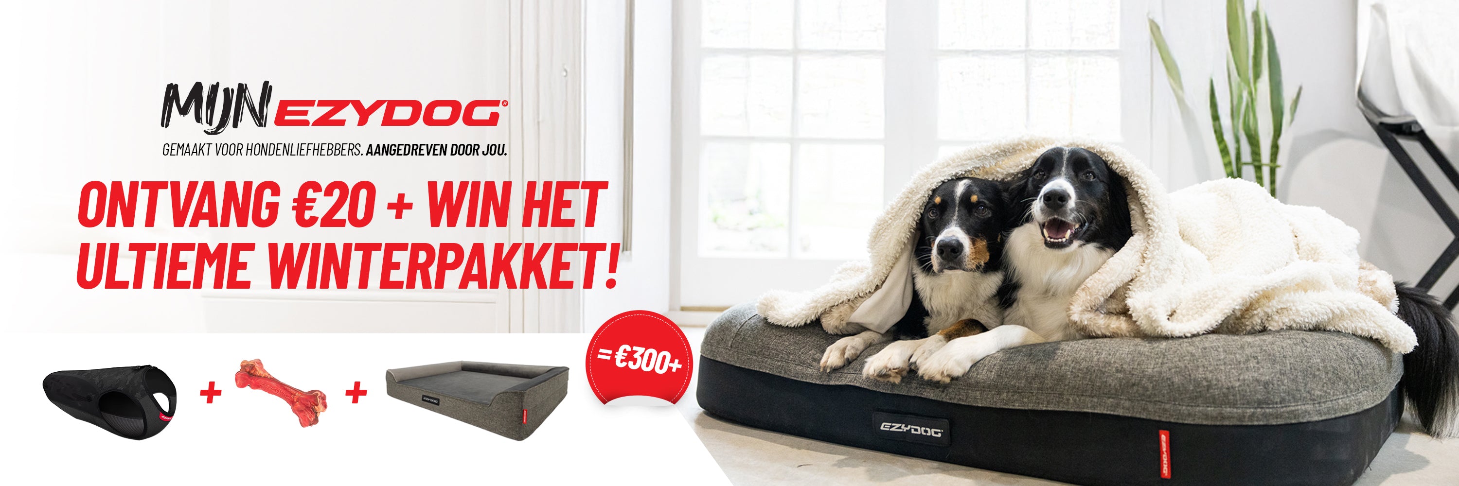 Vanaf nu tot 31 oktober 2025. Vul één huisdierprofiel in tot 100% en je dingt automatisch mee naar het Ultieme Winterpakket, dat bestaat uit een orthopedisch hondenbed naar keuze, een THERMAX vest en een Ezybone kauwspeeltje!